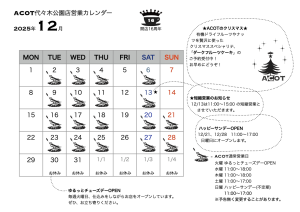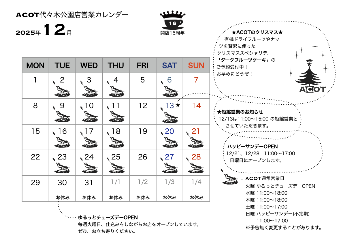 2025年12月の営業カレンダー 2025年12月3日 (News) ACOT代々木公園店の12月の営業カレンダーです。有機ドライフルーツやナッツを贅沢に使ったクリスマススペシャリテ、「ダークフルーツケーキ」のご予約受付中!お早めにどうぞ! 画像をクリックすると拡大します。