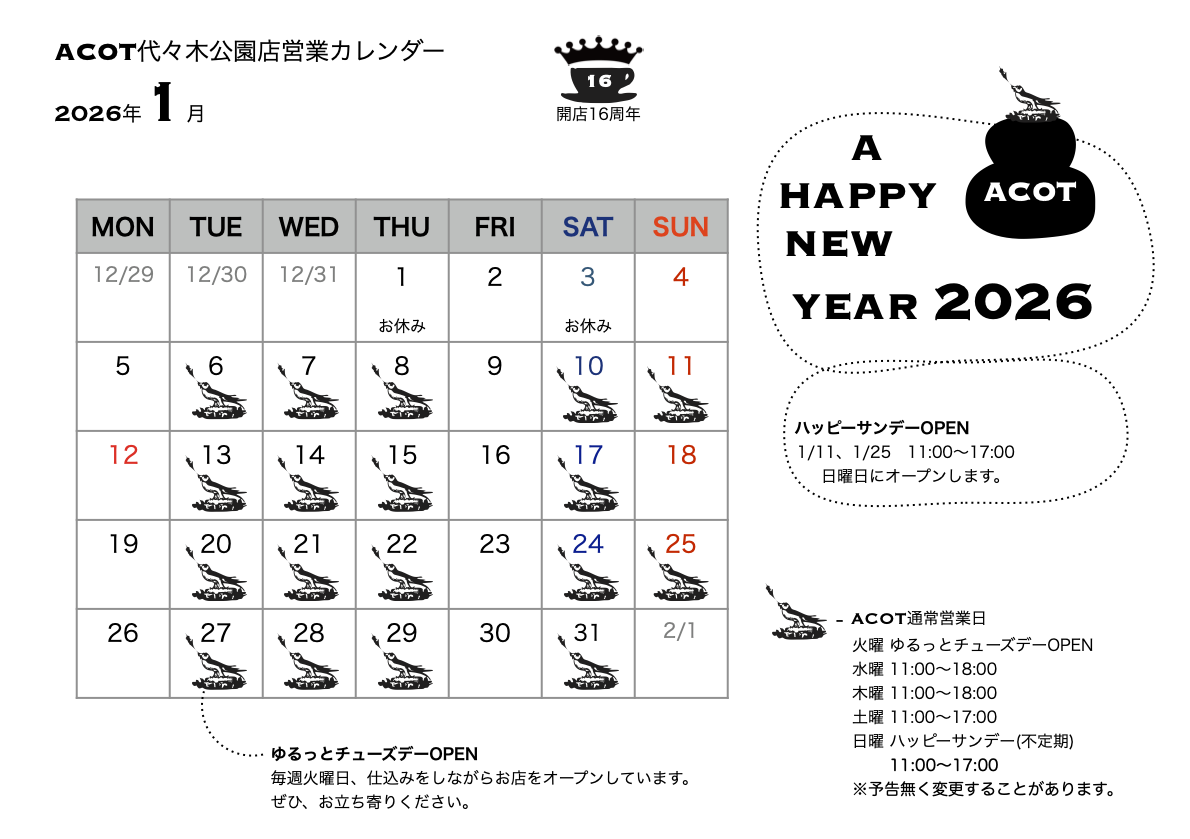 2025年11月の営業カレンダー 2025年11月2日 (News) ACOT代々木公園店の11月の営業カレンダーです。 おかげさまでACOT代々木公園店はオープン16周年を迎えました。11月8日(土)より、記念のクッキー缶の予約販売を開始します。また、恒例のクリスマススペシャリテの予約も開始予定です。画像をクリックすると拡大します。