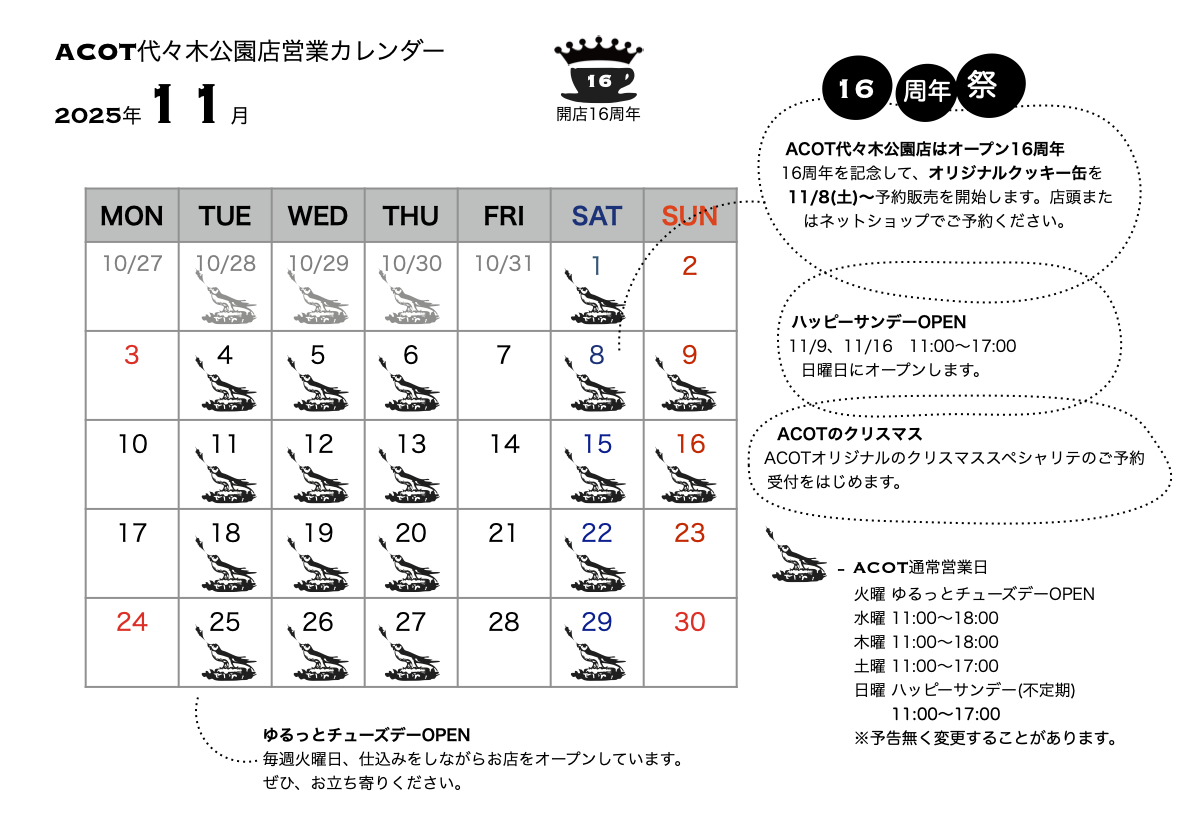 2025年11月の営業カレンダー 2025年11月2日 (blog) ACOT代々木公園店の11月の営業カレンダーです。 おかげさまでACOT代々木公園店はオープン16周年を迎えました。11月8日(土)より、記念のクッキー缶の予約販売を開始します。また、恒例のクリスマススペシャリテの予約も開始予定です。画像をクリックすると拡大します。