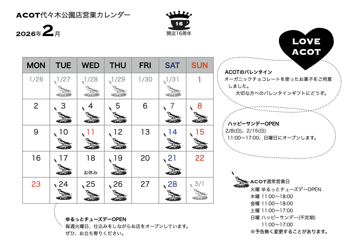 ACOT代々木公園店の2月の営業カレンダーです。